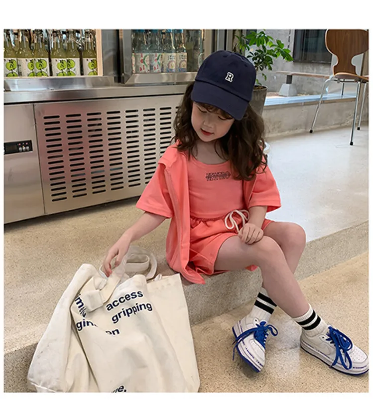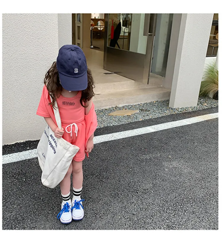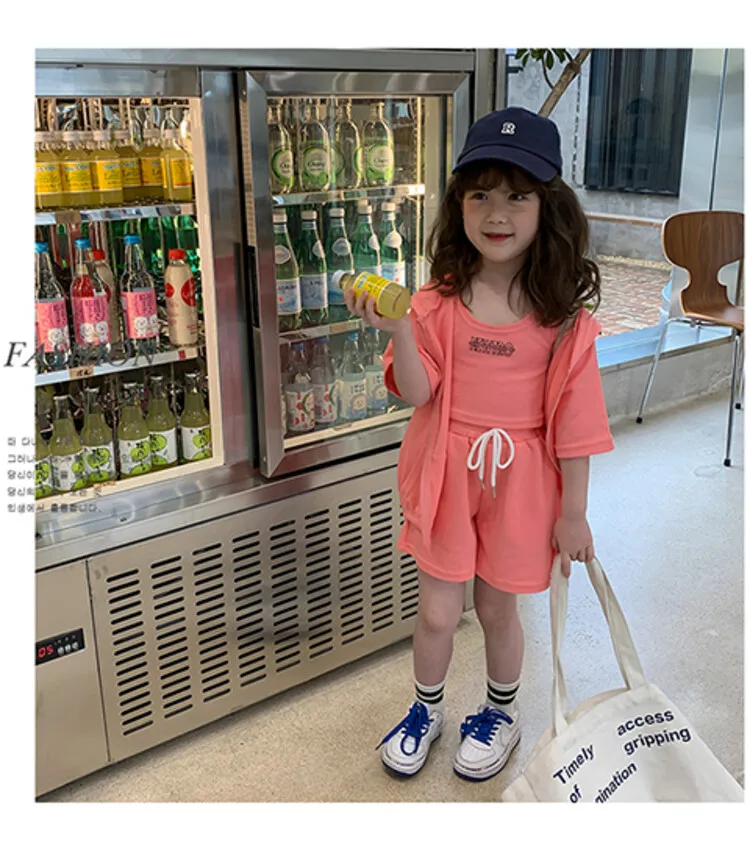 Summer New Girls' Sports Suits Western-Style Children'S Alphabet Vest Hooded Jacket Shorts Three-Piece Set