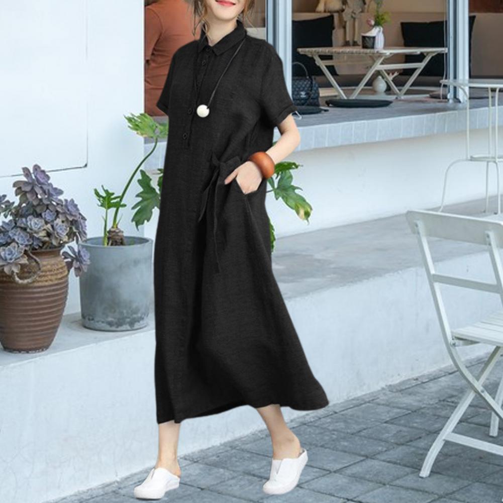 Buttons Half Placket Side Lace-up Pocket Summer Dress Lapel Short Sleeve Summer Shirt Midi Dress Female Clothing