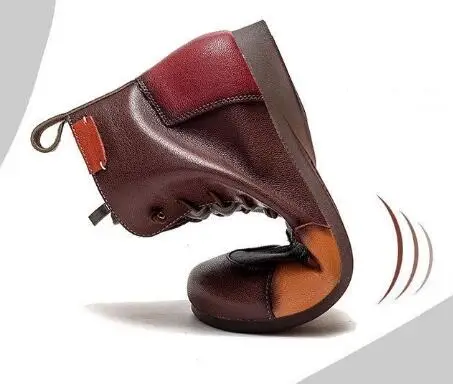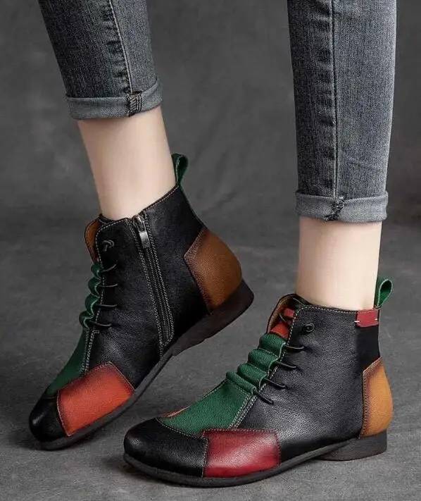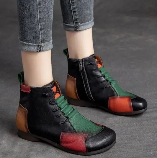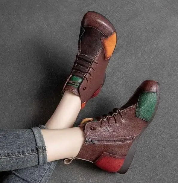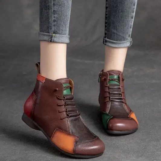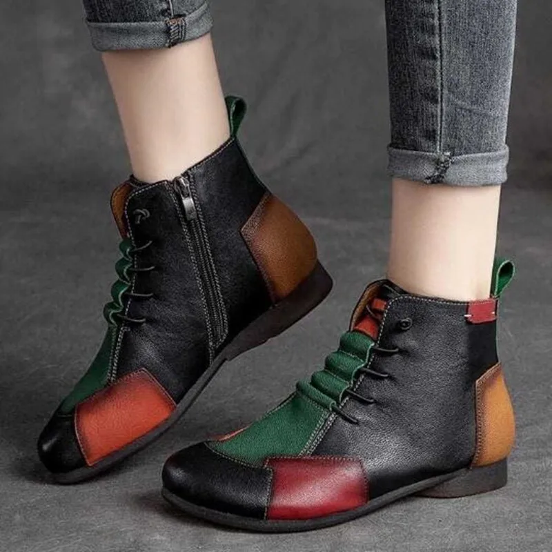 Fashion Female Autumn and Winter New Retro Shoes Lace Round Head Rubber Bottom Color Flat Leather Sole Boots Mother Boots