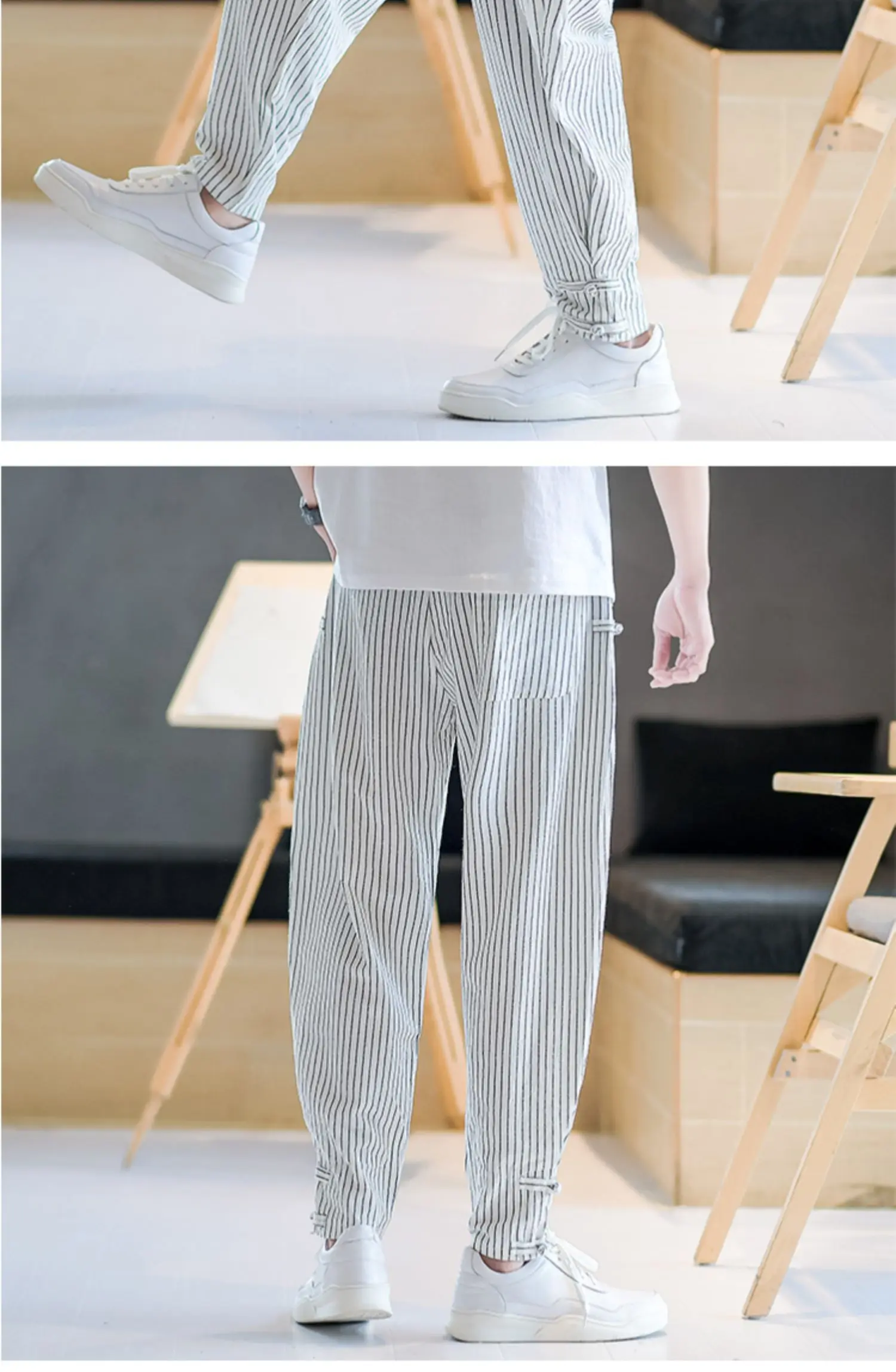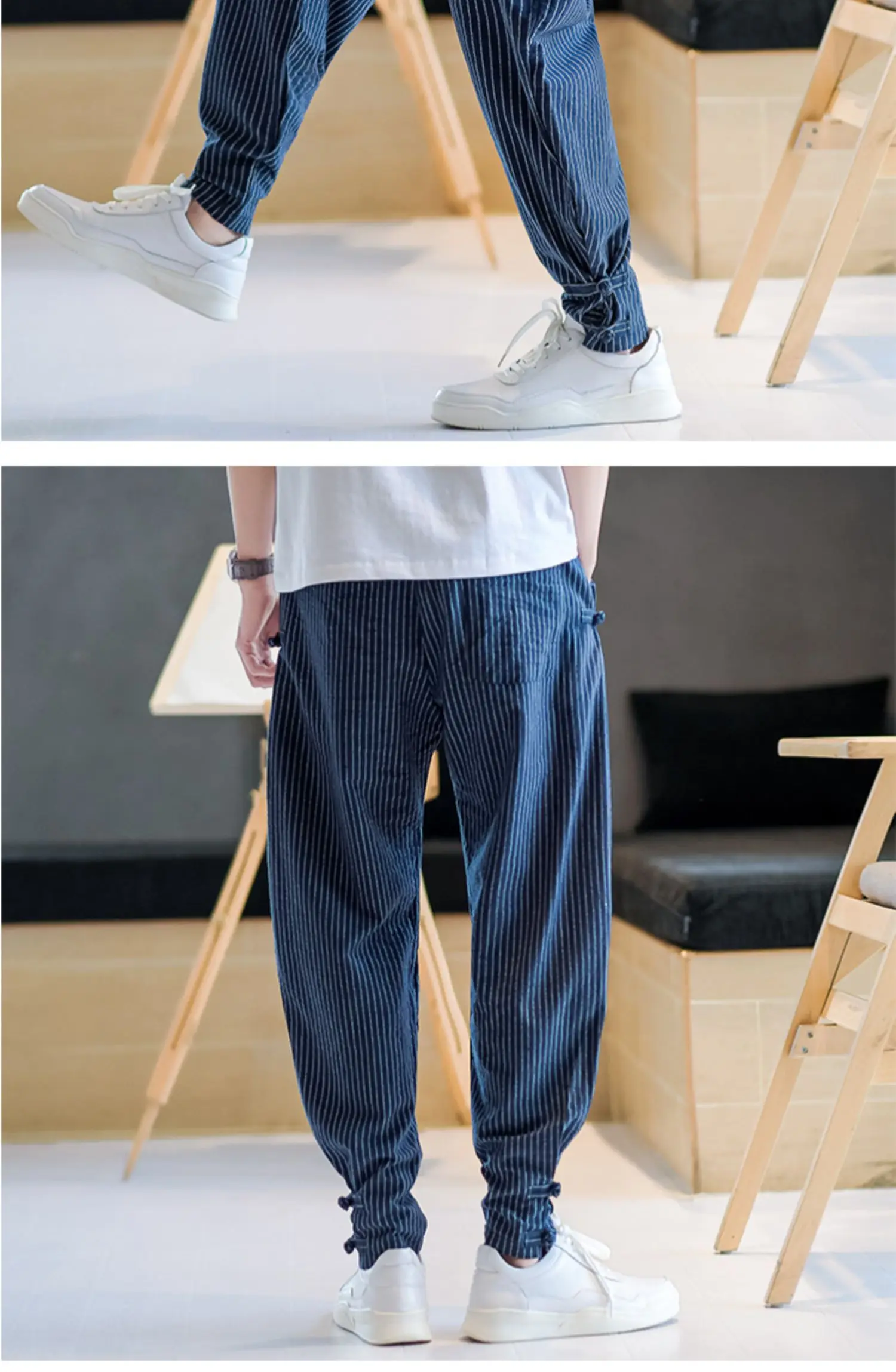 MrGB Cotton Linen Casual Pants Men's Cross Button Stripe Chinese Style Baggy Male Harem Pants Large Size 5XL Retro Trousers