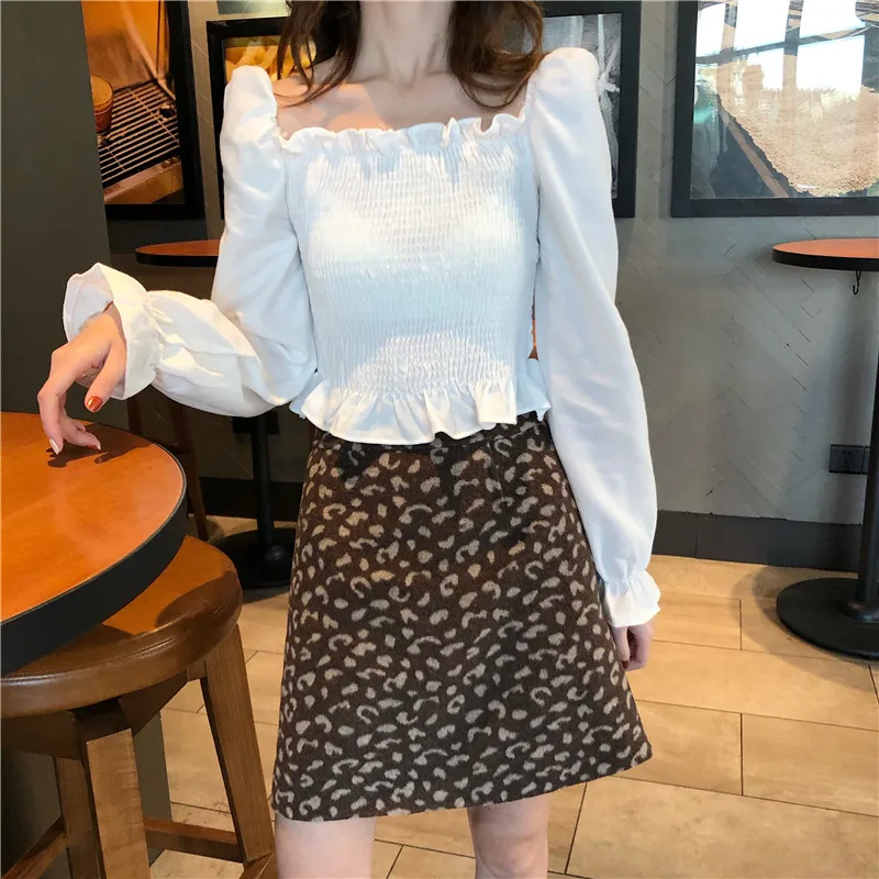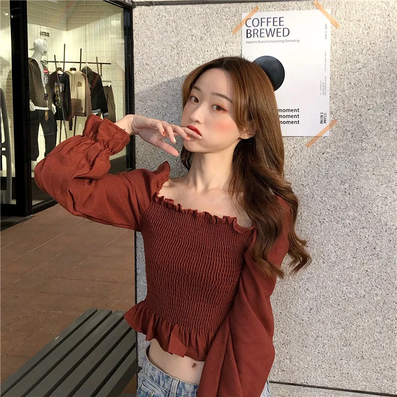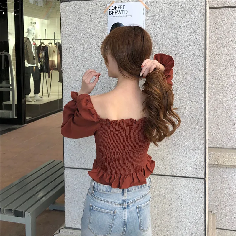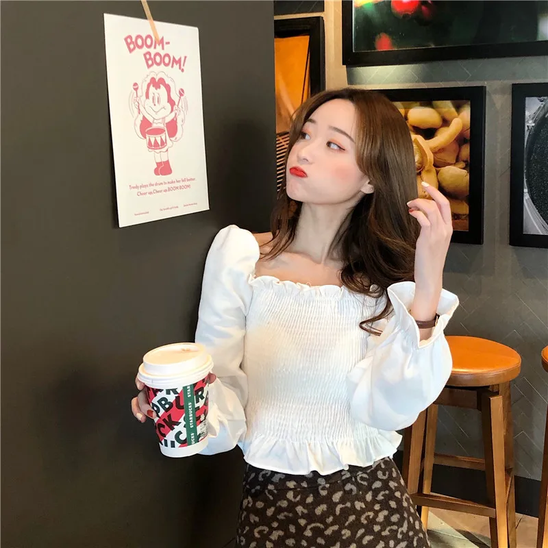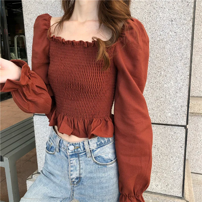 Spring Ruffles Crop Top Women Pleated Blouse Sexy Square Collar Womens Tops And Blouses Puff Sleeve Ladies Clothes Blusas Mujer