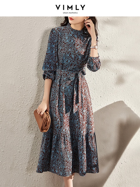 Vimly Elegant Vintage Dresses for Women Spring Stand Collar Belt Slim Long Sleeve Ladies Floral Chiffon Swing Midi Dress