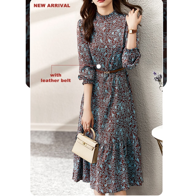 Vimly Elegant Floral Dresses for Women Spring Autumn Long Sleeve Midi Women’s Swing Vintage Chiffon Dress with Belt F8750